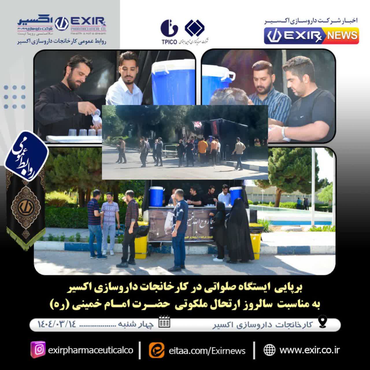 به مناسبت سالروز ارتحال ملکوتی حضرت امام خمینی (ره)، ایستگاه صلواتی در پایان ساعت کاری روز چهارشنبه، چهاردهم خرداد ماه، در کارخانجات داروسازی اکسیر برپا و شربت میان کارکنان توزیع شد. روابط عمومی کارخانجات داروسازی اکسیر ┄┄┅═✧❁💠❁✧═┅┄ ⚜Exir News⚜ 🌐 www.exir.co.ir ‌ 💠جهت اطلاع از اخبار خانواده بزرگ اکسیر به ما بپیوندید 👇👇👇 💠 eitaa.com/Exirnews