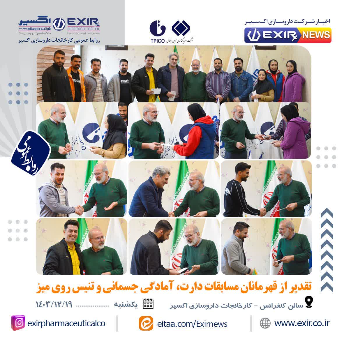 تقدیر از قهرمانان مسابقات دارت، آمادگی جسمانی و تنیس روی میز ✍به گزارش روابط عمومی کارخانجات داروسازی اکسیر یکشنبه، نوزدهم اسفند ماه، با حضور محمد مقدسی، سرپرست مدیریت منابع انسانی کارخانجات داروسازی اکسیر، از نفرات برتر مسابقات دارت(ویژه خانم ها)، آمادگی جسمانی و تنیس روی میز(ویژه آقایان) تقدیر به عمل آمد. محمد مقدسی ضمن آرزوی موفقیت روزافزون برای این همکاران پرتلاش، روحیه پهلوانی و جوانمردی را از ملزومات ارتقای محیط‌های کاری دانست و هدف اصلی برگزاری این مسابقات را ایجاد روحیه دوستی و صمیمیت میان کارکنان عنوان کرد. وی در ادامه با اهدای هدایای نقدی از زحمات این عزیزان قدردانی و تشکر به عمل آوردند. ┄┄┅═✧❁💠❁✧═┅┄ ⚜Exir News⚜ 🌐 www.exir.co.ir 💠جهت اطلاع از اخبار خانواده بزرگ اکسیر به ما بپیوندید 👇👇👇 💠 eitaa.com/Exirnews